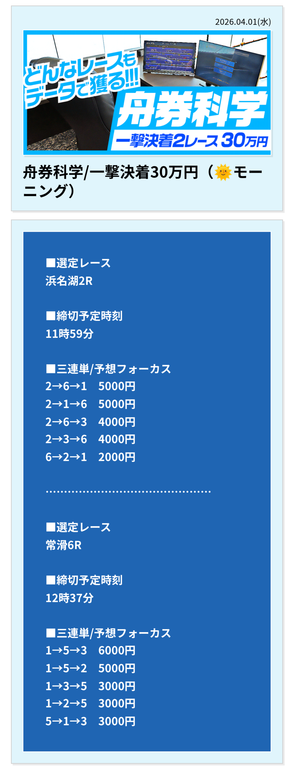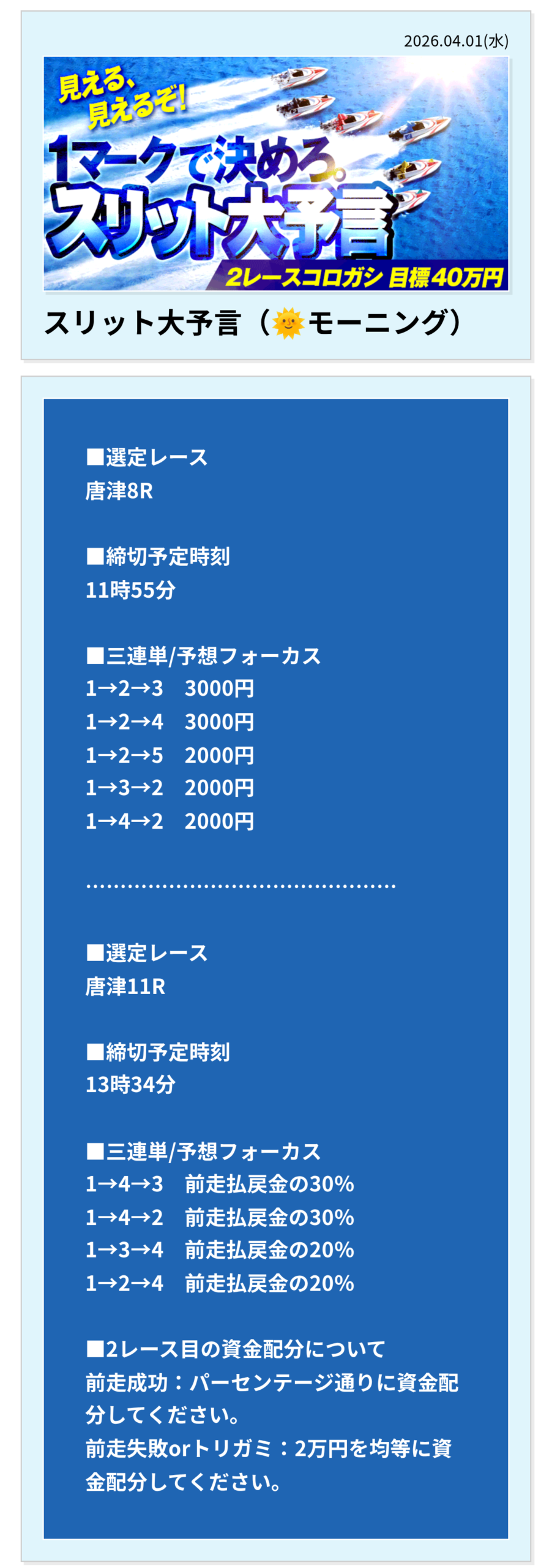 ボートレースパレードの特徴は、「当てられるレースがある」と謳うほど的中に絶対的な自信があることが窺えます。