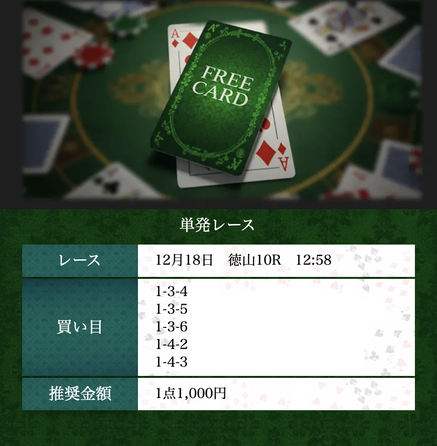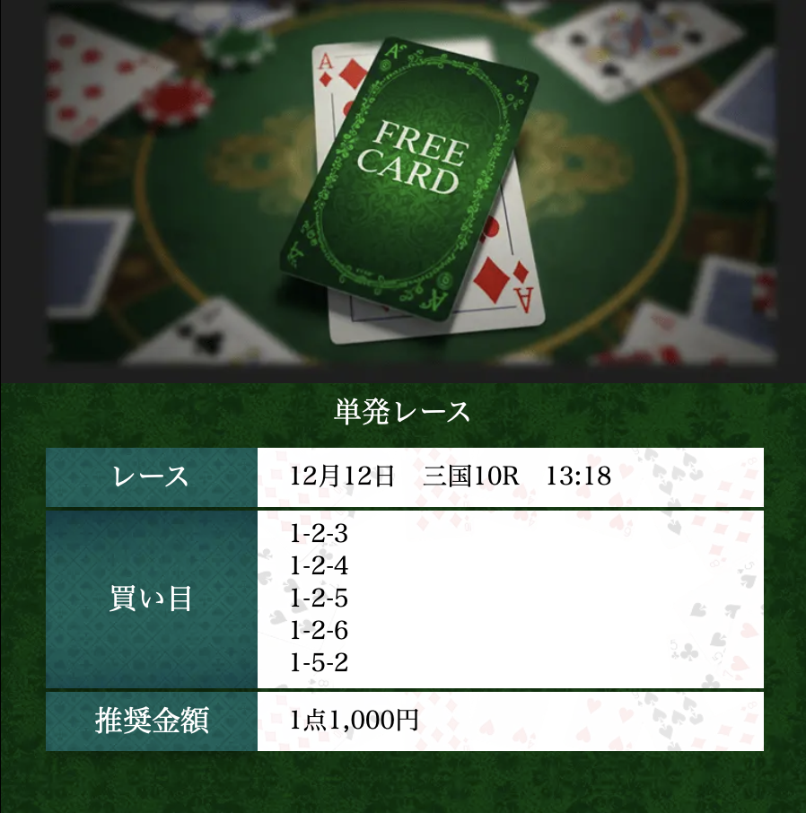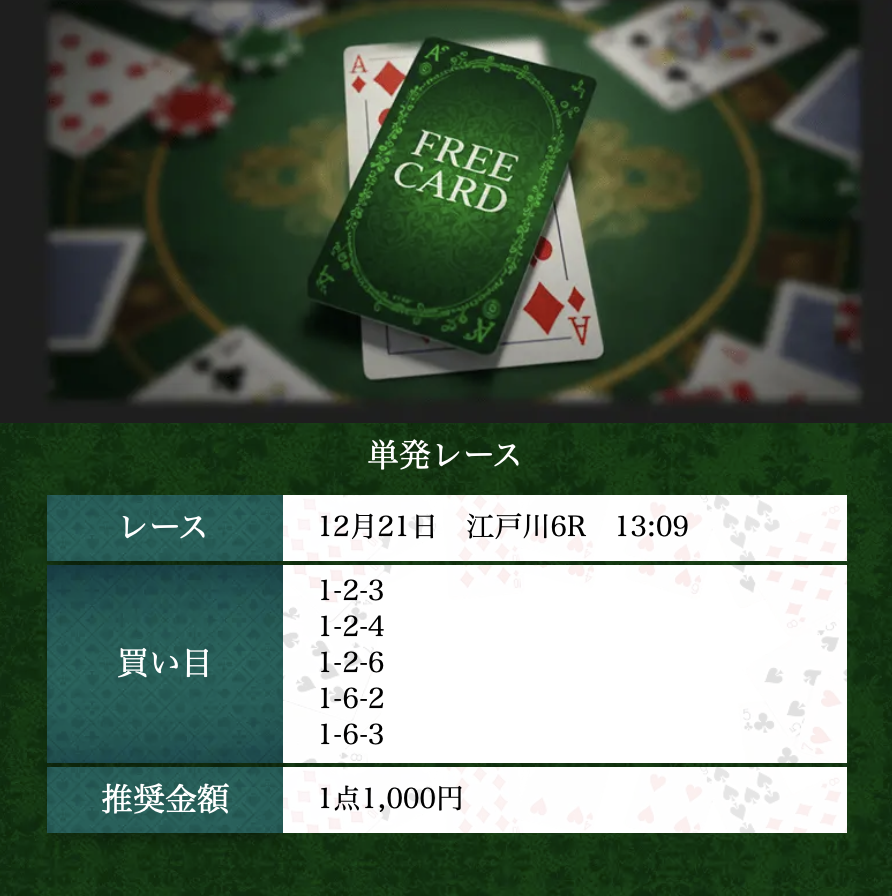 無料予想は毎日1レース提供で、予め参加することで買い目を閲覧することができます。