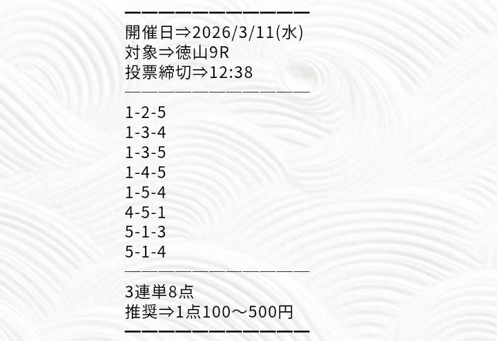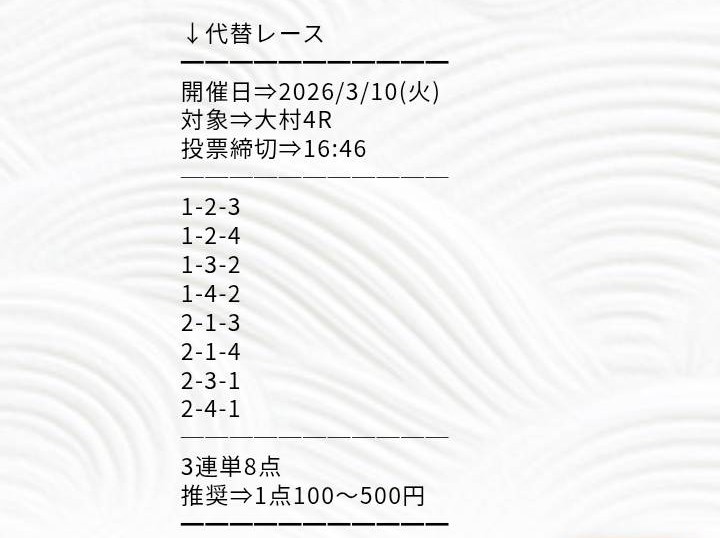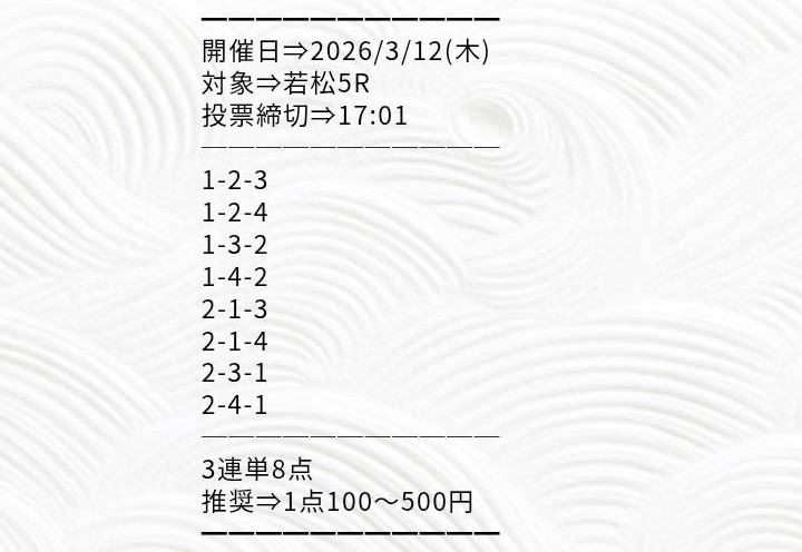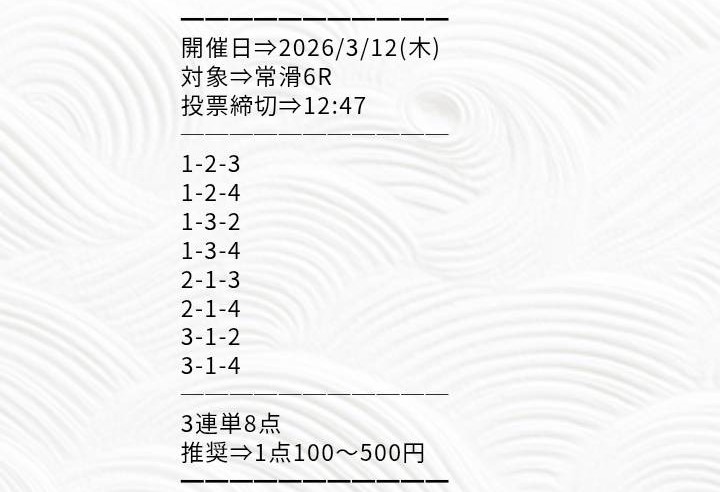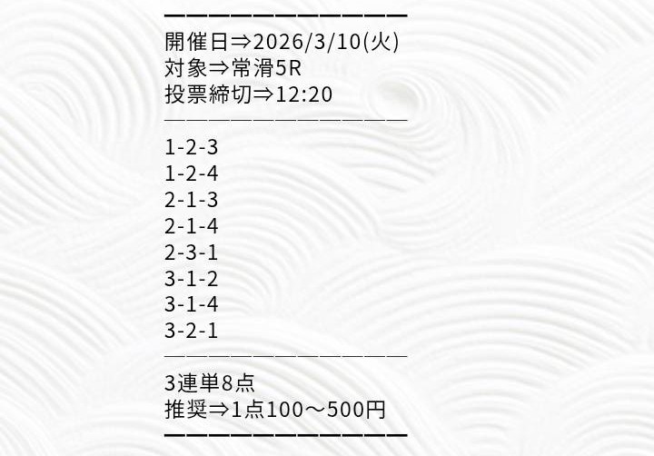| 12戦1勝 的中5件 | 払戻金2,920円 舟券代9,600円 |
