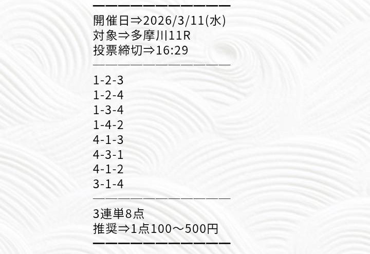 | 展開支配理論 | 100万円 | 800pt(80,000円) | 1レース1万円 | 2レース(コロガシ)3連単 |