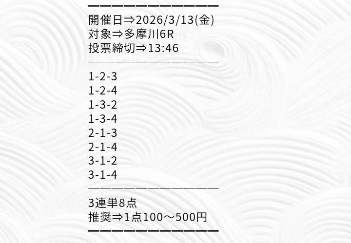 | 風波連動ロジック | 50万円 | 400pt(40,000円) | 1レース1万円 | 2レース(コロガシ)3連単 |