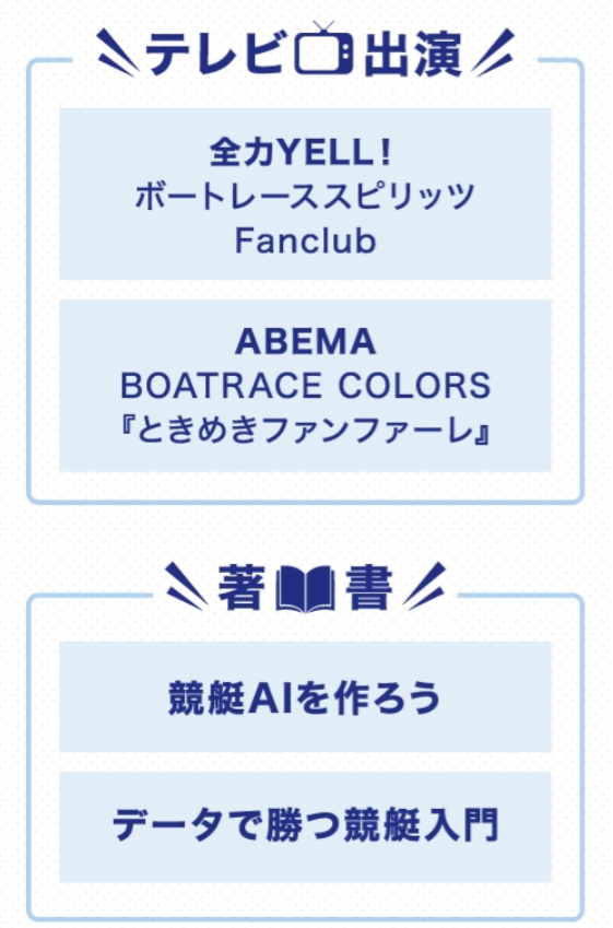 競艇博士ゆうじは自身の経歴について、テレビ番組、ウェブ番組(ABEMA)に出演していると説明しています。
