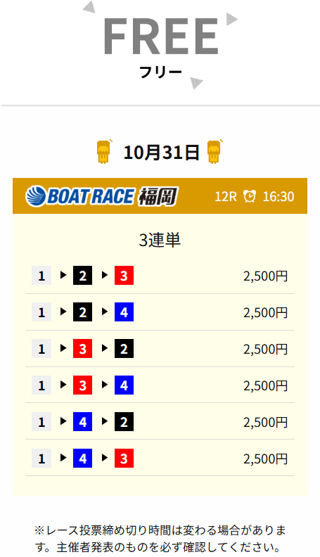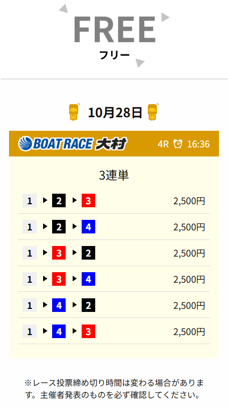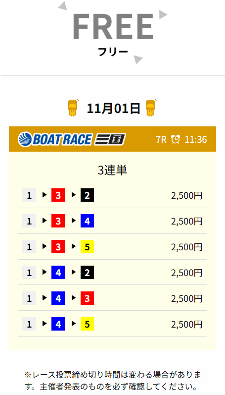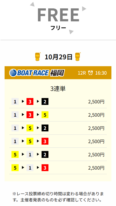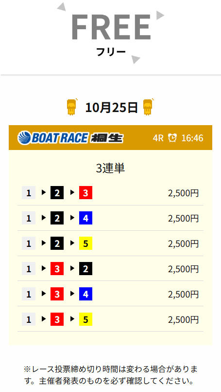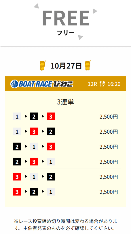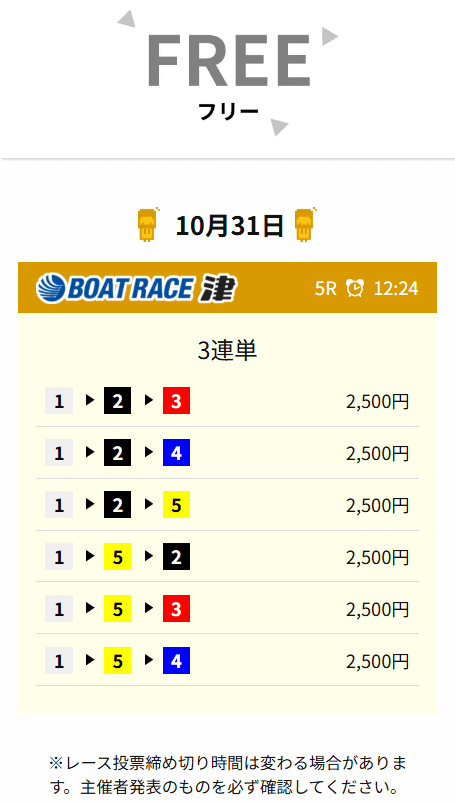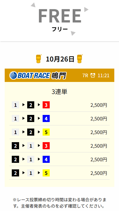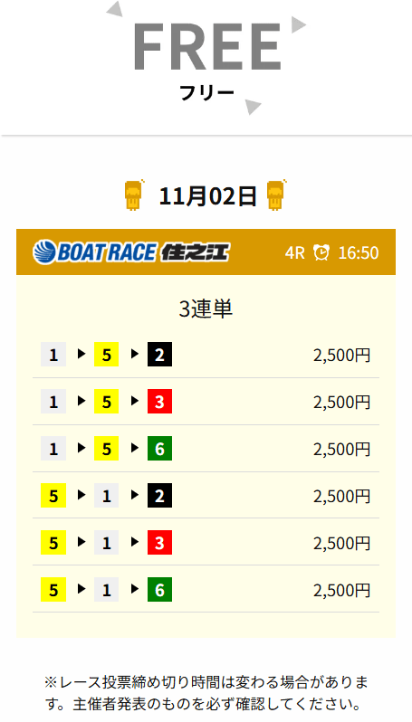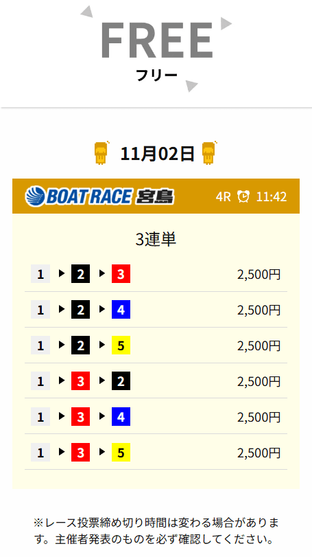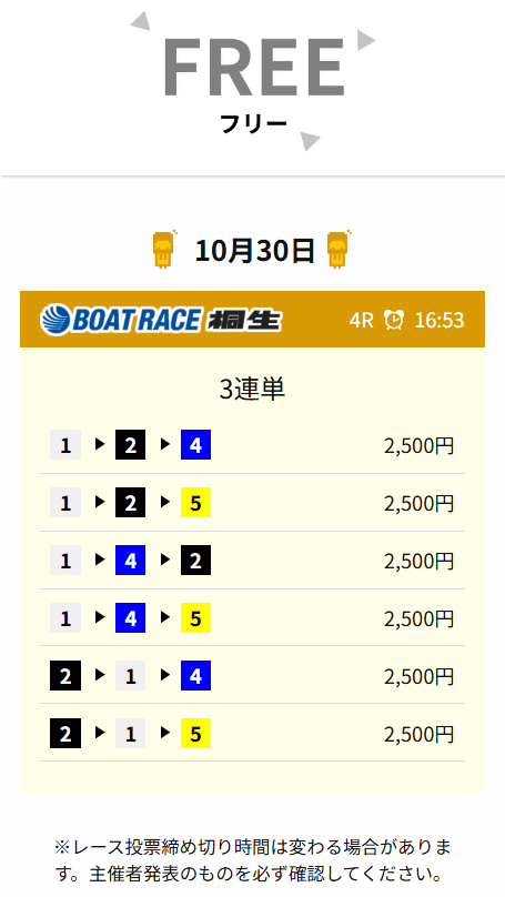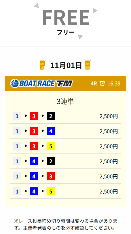 なお、無料情報は毎日2レース提供により、予め参加することで買い目が閲覧できます。