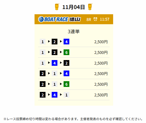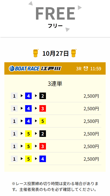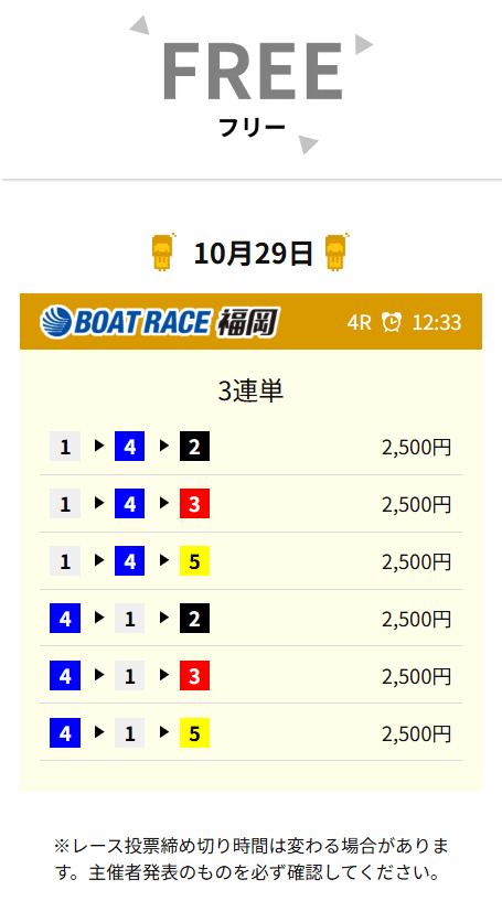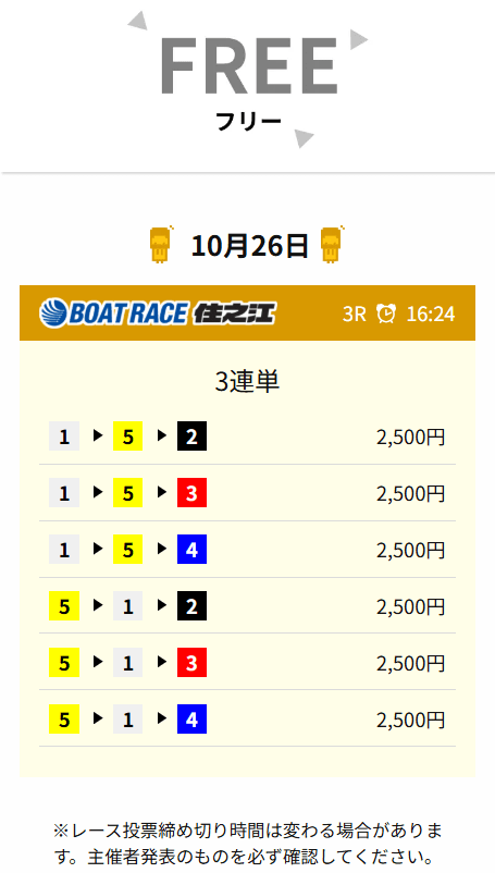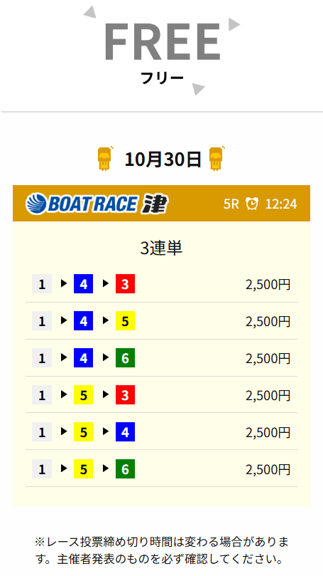 | 舟券代 | 1レースあたり15,000円 買い目1点あたり2,500円 |