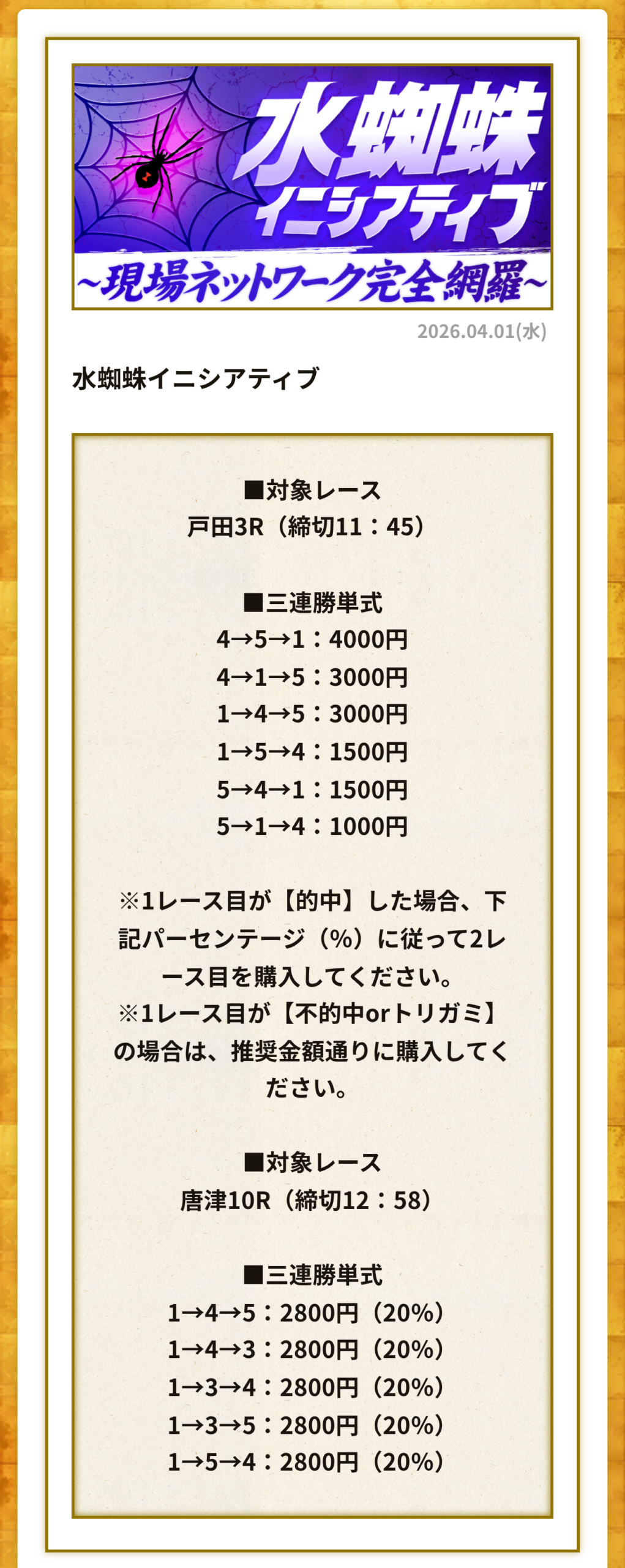 | 水蜘蛛イニシアティブ | 60万円 | 14,000円 | 26,000円 | 2レース(コロガシ)3連単 |