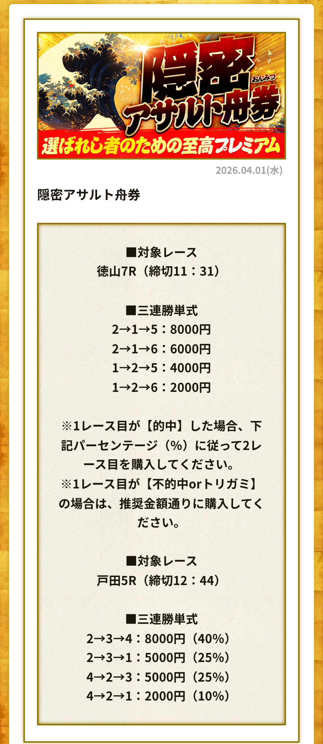 | 隠密アサルト舟券 | 240万円 | 20,000 | 184,000円 | 2レース(コロガシ)3連単 |
