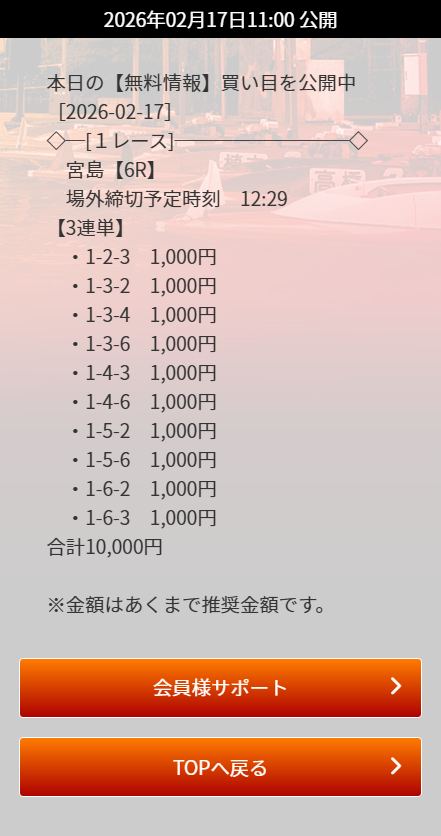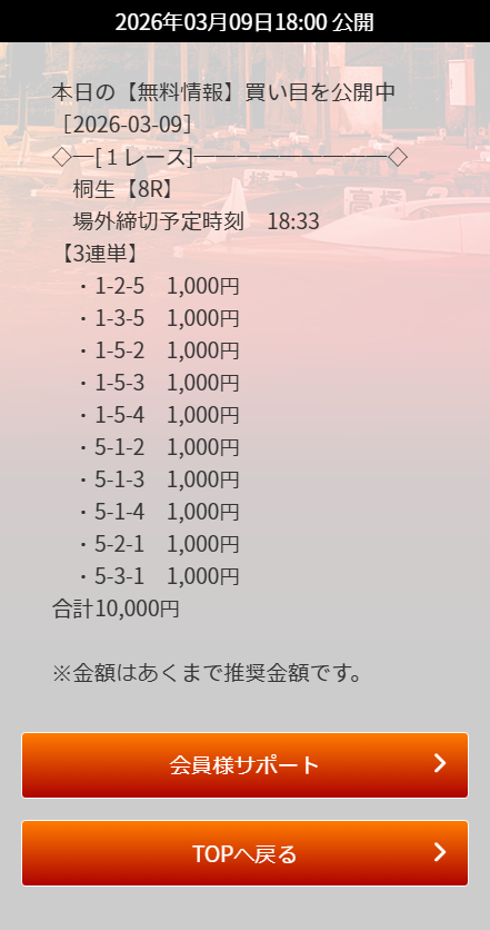 なお、無料予想は毎日2レース提供あり、予め参加する事で買い目が確認できます。