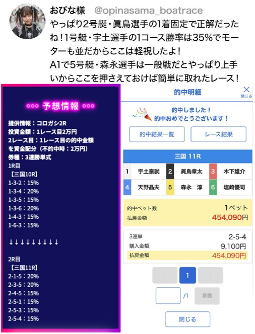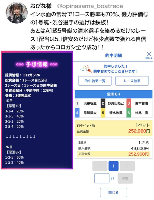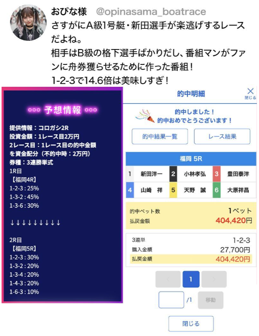上記画像にある「@opinasama-boatrace」は、一見SNSのアカウント名っぽいですが、Xやインスタなどを調査しても見当たりませんでした。