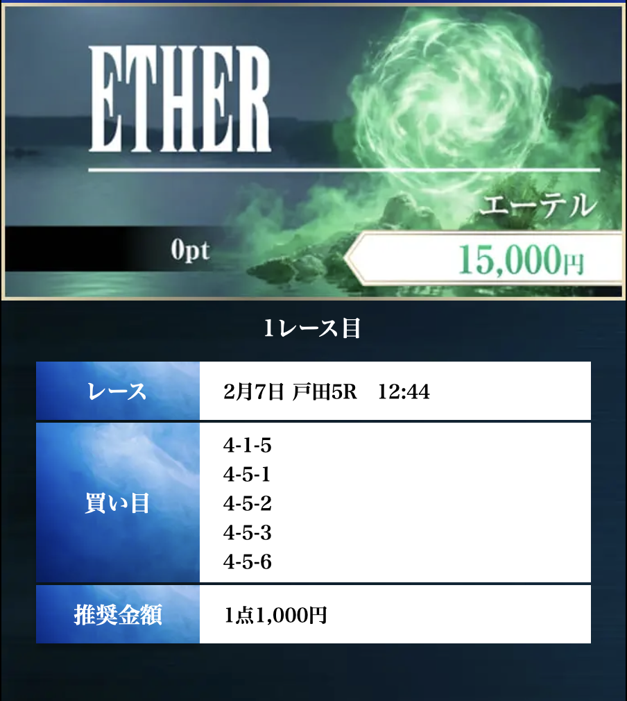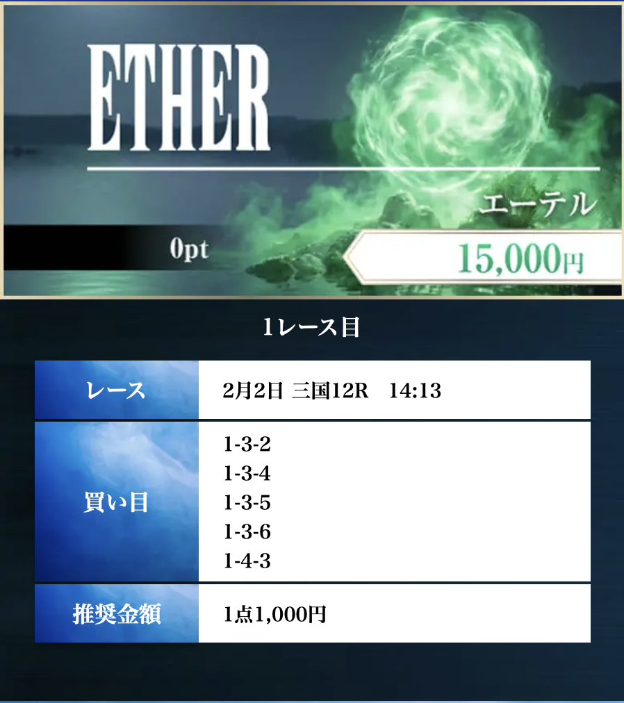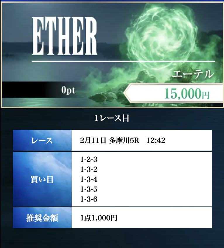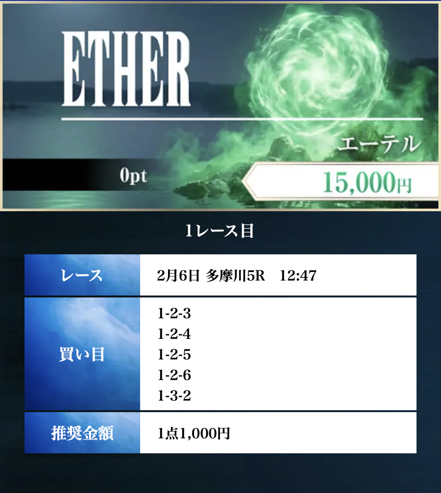 | エーテル | 15000円 | 0pt(0円) | 5,000円 | 1レース 3連単5点 |