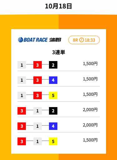 競艇レジェンド | 口コミ75 件 | 1日2レース 1レースあたり1万円 3連単6点 1点あたり不均等 |