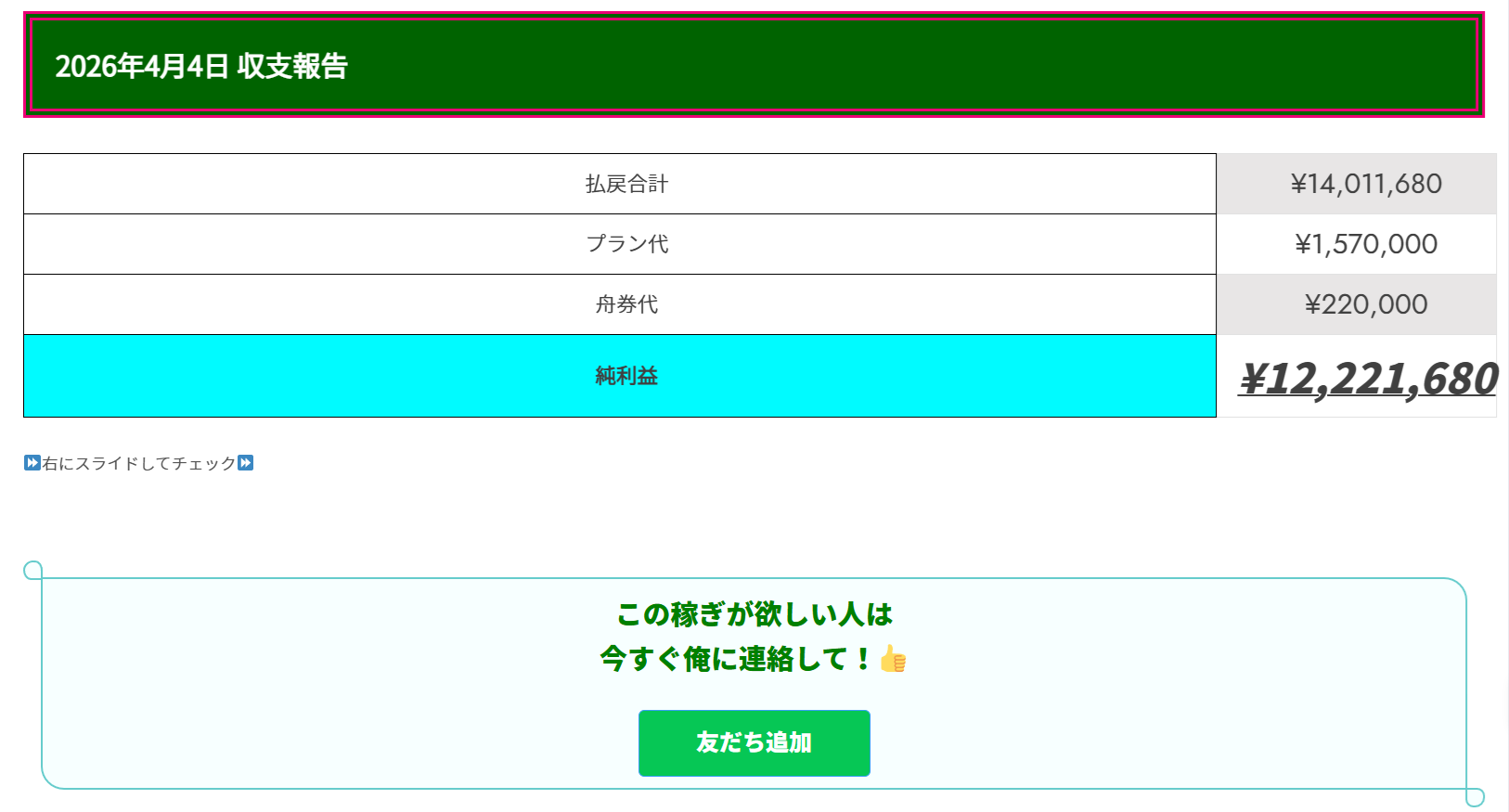 日々の収支報告だけを見れば、艇汪フランキーが言う「月間5000万円」は嘘ではないように思われます。