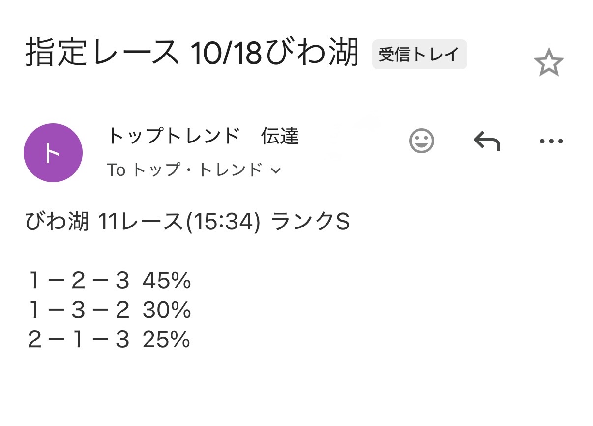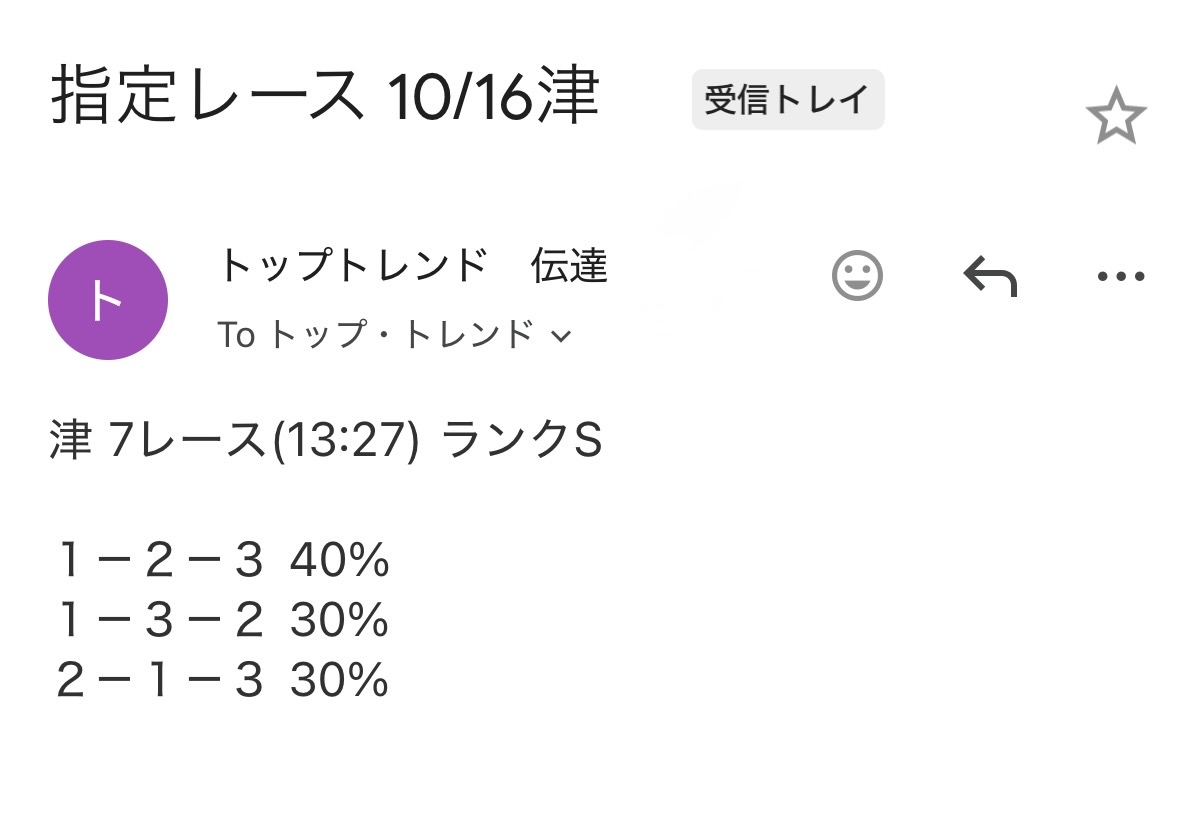 買い目予想はこのメールで確認をする為、メールの受信・拒否設定などをされてる方は「@top-tre.com」からのメールは受信するよう設定することをお勧めします。