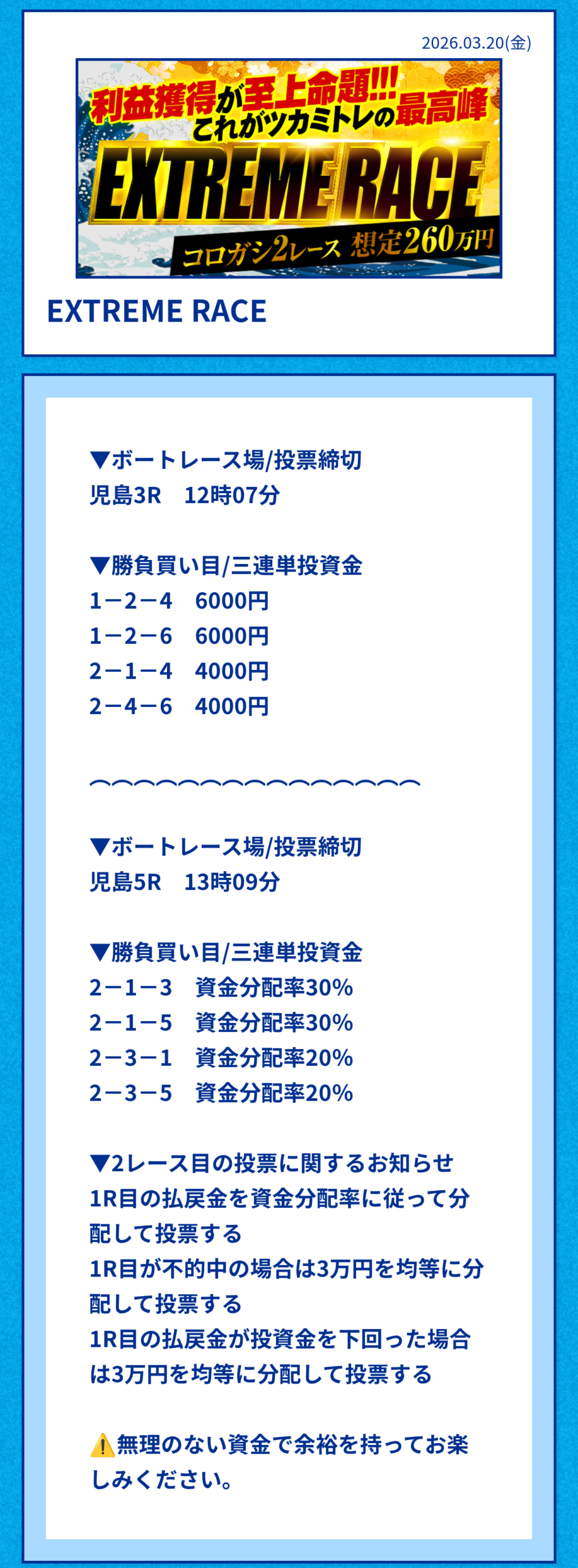 | EXTREME RACE | 260万円前後 | 195,000円 | 10,000円 | 2レース(コロガシ)3連単 |