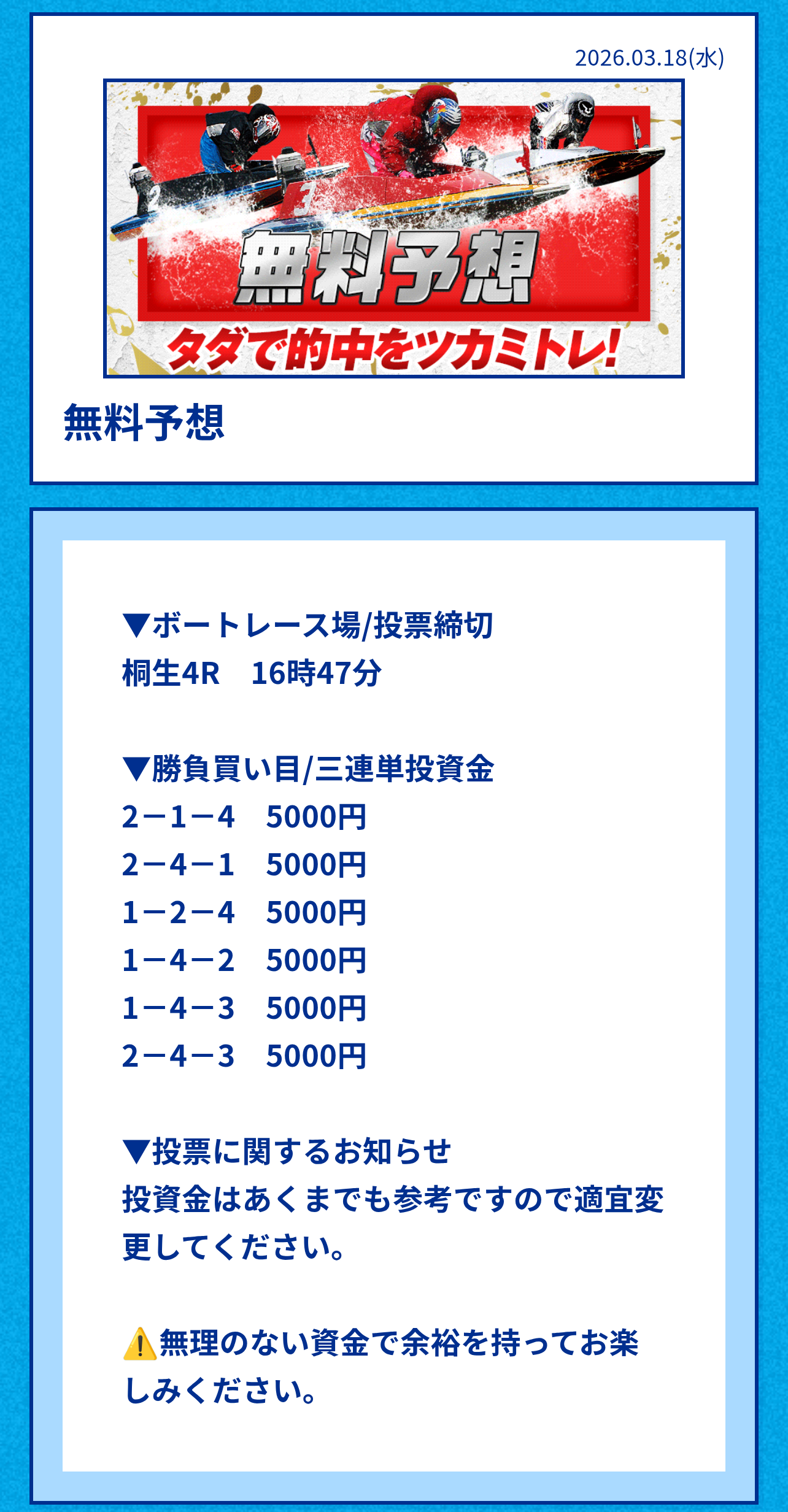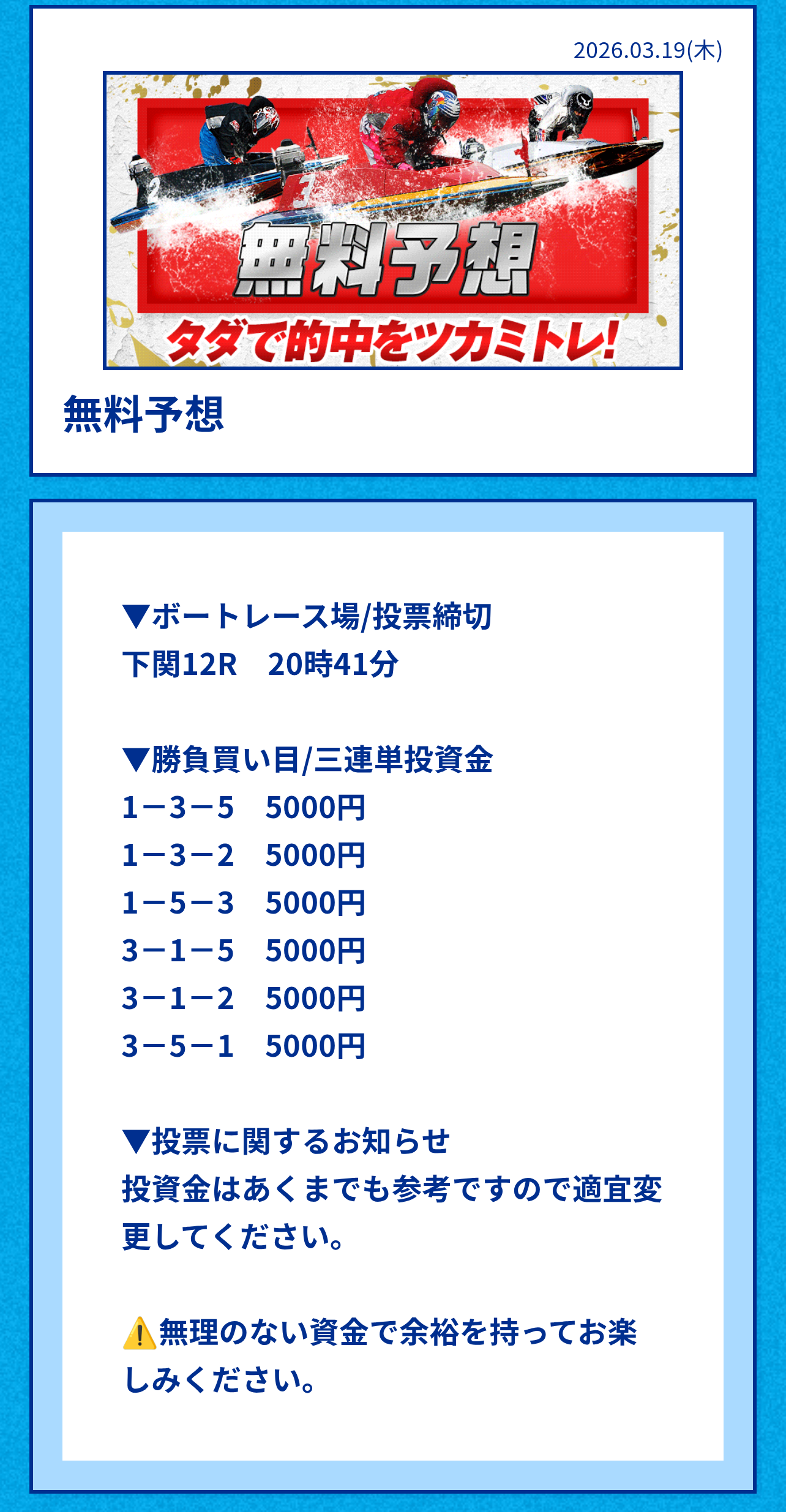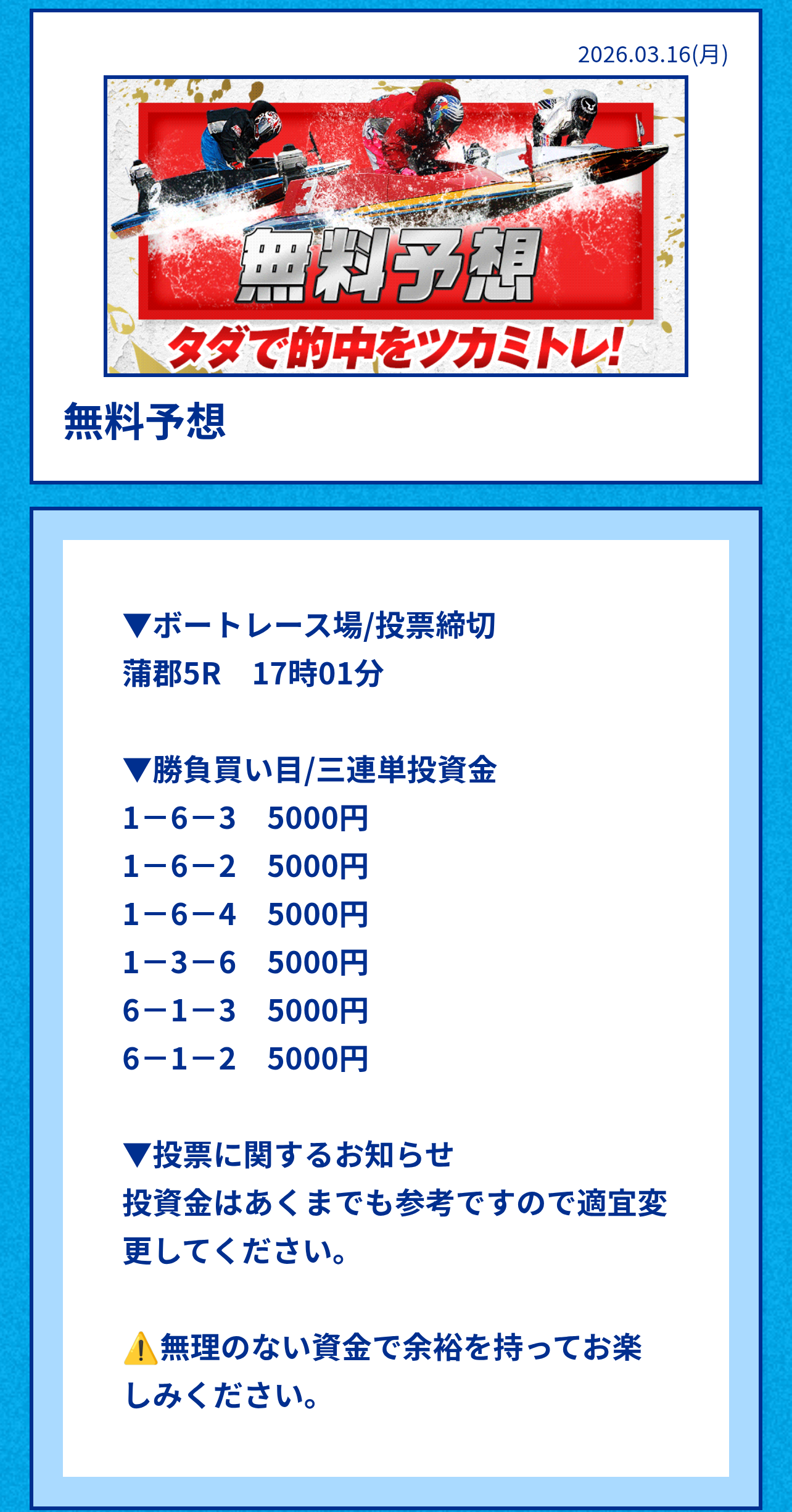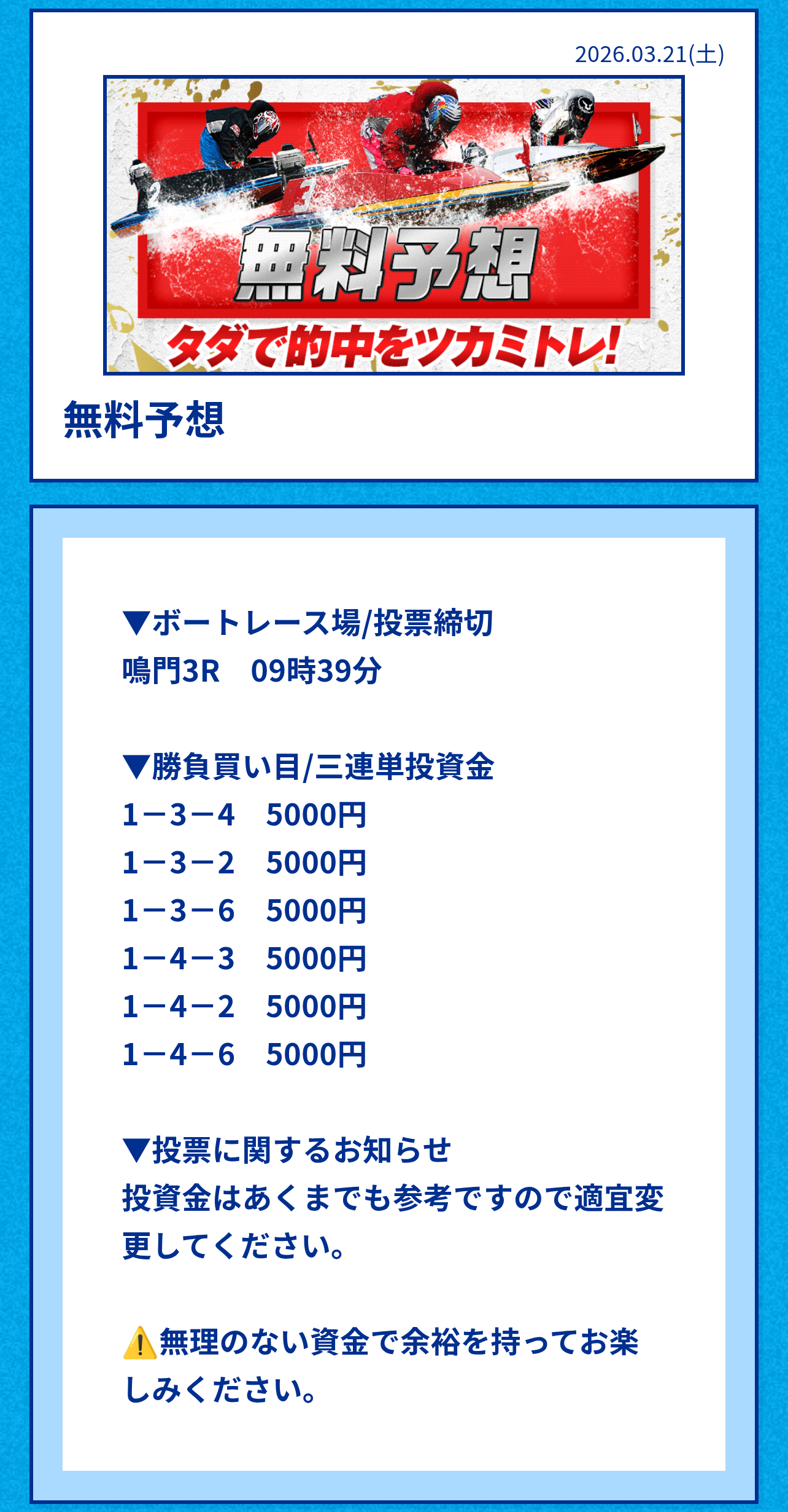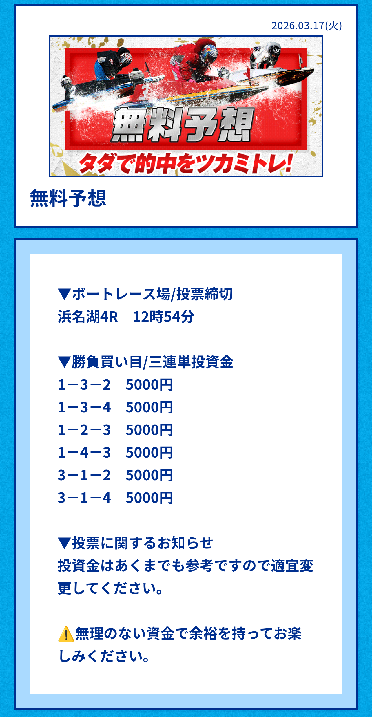 ・無料予想は舟券代推奨3万円と高価格の為、買う場合は自己で調整がおススメ。