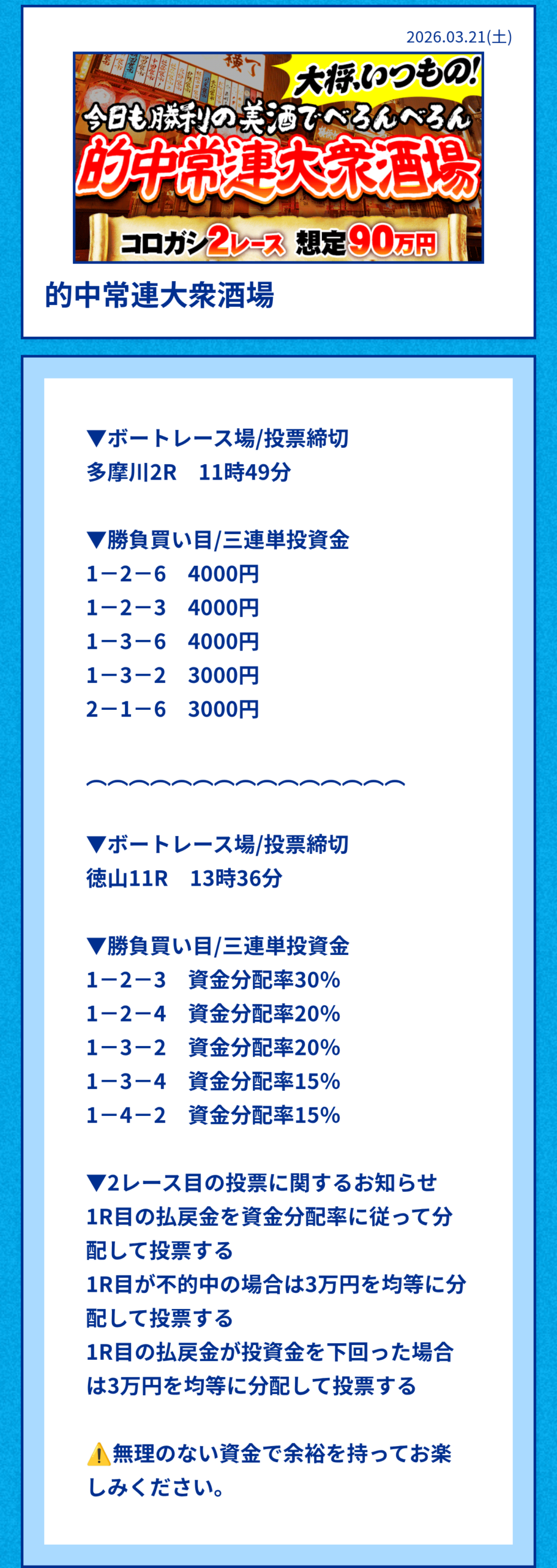 | 的中常連大衆酒場 | 90万円前後 | 86,000円 | 10,000円 | 2レース(コロガシ)3連単 |